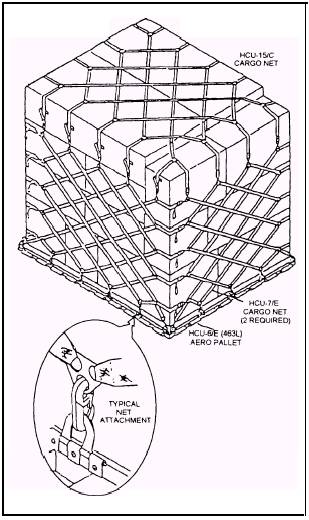Figure 6-25.-463-L pallet with cargo and net. the outside perimeter of the pallet load. Cargo can be loaded on the pallet up to 96 inches high, and the weight limitation is 10,000 pounds per pallet maximum. Each pallet has a total of 22 tie-down rings (six on the long side and five on the short side) that match up with the cargo net fasteners. 463-L pallets lock into the aircraft by a rail on each side of the aircraft. When loads are placed on a pallet, three point dunnage must be placed under each pallet. The size of the dunnage must be at least 4- by 4- by 88-inch timbers. One timber must be placed under the center of the pallet and one under each outside edge of the pallet; this helps prevent warping of the pallets. To store empty pallets, you should first put down one set of three point dunnage, then stack the pallets no more than 10 high. If more pallets must be stacked, another set of dunnage must be placed on top of the first 10 pallets, then 10 more pallets can be stacked. This sequence can be repeated up to a maximum of 40 pallets. Each pallet must be stacked with the cargo loading surface facing in an upward direction. During the pallet-building process (placing cargo on the pallets), always load heavy cargo in the center of the pallet and build it up with lighter cargo around it. This will keep the center of balance at the center of the pallet. All cargo loaded on a 463-L pallet must be placed close together with no open space between them. If space is left between cargo items, the cargo may shift on the pallet during flight and could cause damage to or even loss of the aircraft. |