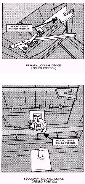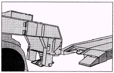 Figure 7-6.-Tilt-bed deck-locking mechanism. 3. When the tilt-bed trailer is in the tilt position, you should ensure the rear of the bed is resting on even ground. 4. Do not place heavy loads beyond the deck hinge. 5. Failure to follow the above rules can result in severe damage to the tilt-bed trailer and to the locking mechanism. Detachable Gooseneck Trailer The detachable gooseneck trailer (fig. 7-7) is often identified by the term drop neck and is designed so the gooseneck can be removed, leaving the front of the frame resting on the ground (fig. 7-8). This feature allows equipment to be loaded readily, using short ramps (usually hinged to the deck) or small blocks. The primary reason for performing a prestart inspection is to ensure your tractor-trailer is safe. When performing your prestart inspection, you should use the same procedure each time. If you do so, you will be less likely to forget anything. A prestart inspection aid is shown in figure 7-9. The following prestart inspection can be used as a procedure when performing prestart on all automotive equipment. All problems should be documented on the "Hard Card" NAVFAC 9-11240/13 and repaired as required. Do not operate any equip ment that does not meet safety standards. All safety features must be in operational order before any piece of equipment is used.