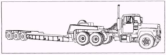 Low-Bed Trailer The low-bed trailer (fig. 7-4) is often identified by the term lowboy. This trailer is used for hauling heavy equipment and material that is overheight and overweight for stake trailers. Low-bed trailers are heavily constructed to handle loads of 35 tons or more. Tilt-Bed Trailer The tilt-bed trailer (fig. 7-5) is often identified by the term tilt-top and is designed to tilt toward the rear for ease of loading and unloading without the use of ramps. Tilt-beds are primarily used to haul equipment; however, they also are used to transport construction materials and supplies. To avoid damaging equipment and trailers, you should remember the following rules: 1. Do not attempt to load heavy equipment on a tilt-bed trailer from a loading ramp or a dock. 2. Before loading heavy equipment on a tilt-bed trailer, you should ensure the locking mechanism (fig. 7-6) is fully disengaged.