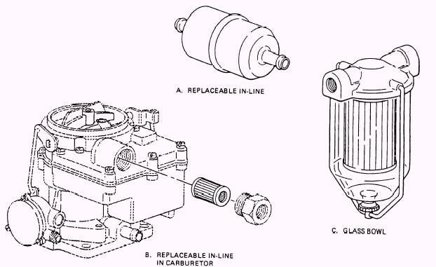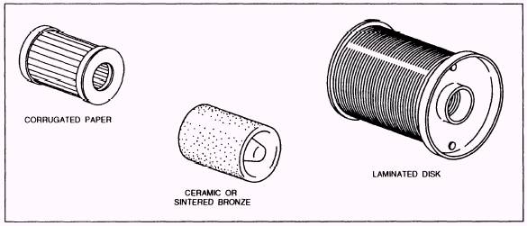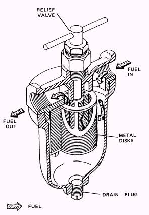 Fuel filters trap foreign material that may be present in the fuel and prevent it from entering the carburetor or sensitive fuel injection components. Gasoline Fuel Filter On a gasoline engine system there is at least one fuel filter used in the fuel system and it can be located in any accessible place along the fuel delivery line. Filters also can be located inside fuel tanks, carburetors, and fuel pumps. The fuel filter operates by passing fuel through a porous material that blocks particles large enough to cause a problem in the system. Some filters also act as sediment bowls; water and larger particles of foreign matter settle to the bottom where they can be drained off (fig. 1-19). Figure 1-20 shows the three types of fuel filters in common use. They are the replaceable in-line filter (view A), the in-line filter element (view B), and the glass bowl (view C). Filter elements are made from ceramic, treated paper, sintered bronze, or metal screen, as shown in figure 1-21. A filter element that differs from the others is a series of closely spaced laminated disks. As the gasoline proses between the disks, foreign matter is blocked out. Diesel fuel filters are called full-flow filters, because all the fuel must pass through them before reaching the injection pumps. They are very important because diesel fuels are more viscous than gasoline and