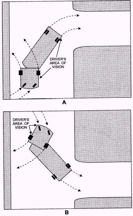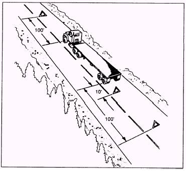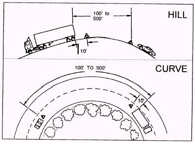 Figure 7-26.-Reflective triangle placement: obstructed view. tractor-trailer on the shoulder or in the lane you are stopped in, as shown in figure 7-25. 2. If you are stopped beyond any hill, curve, or other obstruction that prevents other drivers from seeing the tractor-trailer within 500 feet, place reflective devices, as shown in figure 7-26. 3. If you are stopped on or by a one-way or divided highway, place reflective triangles 10 feet, 100 feet, and 200 feet toward the approaching traffic, as shown in figure 7-27. When driving a tractor-trailer, you must maintain a safe following distance to avoid a rear-end collision. A