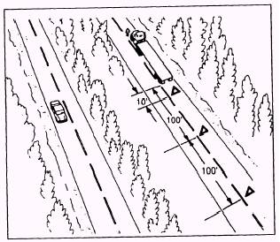 Figure 7-27.-Reflective triangle placement: one way or divided highway. rule of thumb used for measuring how much distance you should maintain from the vehicle in front of you is at least 1 second for each 10 feet of vehicle length at speeds below 40 mph. At greater speeds, you must add 1 second for safety; for example, if you are operating a 40-foot vehicle, you should allow at least 4 seconds between you and the vehicle ahead. In a 60-foot tractortrailer, you need 6 seconds. For over 40 mph, you need 5 seconds for a 40-foot vehicle and 7 seconds for a 60-foot tractor and trailer. To measure distances, wait until the vehicle ahead passes a shadow on the road, a pavement marking, or some clear landmark. Then count off the seconds as "one thousand-and-one, one thousand-and-two" and so forth, until your vehicle reaches the same spot. Compare your count with the rule of 1 second for every 10 feet of length. If you are operating a 40-foot truck and only counted up to 2 seconds, you are too close. LOADING AND SECURING CARGO As a tractor-trailer operator, you must have an understanding of the basic procedures and safety rules used when transporting construction supplies and equipment. Improper loading of any load can be a danger to yourself and others around you, cause damage to the tractor-trailer, affect the steering of the tractor, and so forth. The operator, whether or not you loaded and secured the load yourself, is responsible to inspect the load, to recognize overloads and poorly balanced
