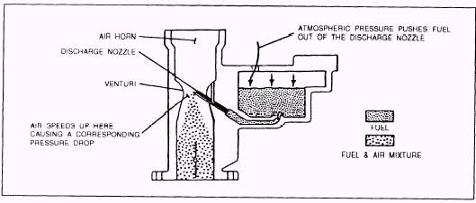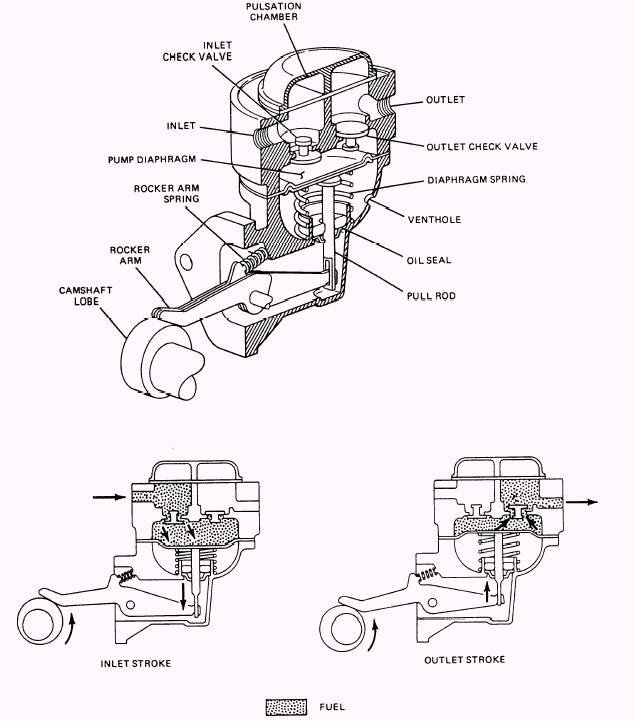 The three basic parts of a gasoline fuel system are the fuel tank, fuel pump, and carburetor. Fuel is supplied from the fuel tank to the carburetor by either a gravityfeed system or a force-feed system. The gravity-feed system has the fuel tank placed above the carburetor (fig. 1-24). Afloat attached to a valve allows fuel to enter the carburetor at the same rate at which the engine is consuming it. This system maintains a uniform level in the carburetor regardless of the amount of fuel in the tank. The force-feed system (fig. 1-24) is where the fuel tank is located below the carburetor and a fuel pump is required. Fuel Pump The fuel pump draws the gasoline through a fuel line from the tank and forces it to the float chamber of the carburetor where it is stopped. Several types of fuel pumps are used; however, the most common type is the mechanical nonpositive fuel pump (fig. 1-25). Carburetor The carburetor is basically an air tube that operates by a differential in air pressure. It has an hourglassshaped tube called a throat and the most constricted part