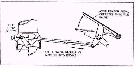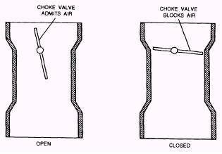Figure 1-27.-Throttle valve. of the throat is called the venturi (fig. 1-26). A tube called a discharge nozzle is positioned in the venturi and is connected to a reservoir of gasoline called the float bowl. The downward intake stroke of the piston creates a partial vacuum in the carburetor throat that allows low-pressure air to rush by the fuel nozzle. This forces small drops of fuel to be mixed with the air. Then the fuel and air mixture must pass the throttle valve which is controlled by the operator (fig. 1-27). The throttle valve opens or closes to allow the correct volume of the fuel and air mixture into the engine. The choke valve (fig. 1-28) also controls the supply of fuel to the engine. When you start the engine in cold weather, the choke valve can be partly closed, forming a restriction that causes more fuel and less air to be drawn into the combustion chamber. This results in a richer air to fuel