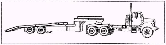 DETACHABLE GOOSENECK TRAILER.- Detachable gooseneck trailers are designed so when the gooseneck is detached you can load a machine from the front without any ramps or tilting of the deck at the balance point. The gooseneck and frame are held together in alignment by removable pins or safety locks. Removing or releasing the pins or safety locks and disconnecting the brake and electrical lines, the two units are lowered to the ground by a hydraulic jack in the gooseneck or by a line from a winch mounted on the tractor. The gooseneck is then detached from the frame and carried or dragged a short distance by the tractor. Ramps are flipped over to rest on the ground, and the equipment is driven up onto the trailer. The gooseneck is backed into place, attached, lifted, and locked. The brake and electrical line are reconnected, and the ramps are folded onto the deck of the trailer. You can also load from the rear, like a regular low-bed trailer. Before you operate this type of trailer, read and understand the operator's manual. These trailers have low ground clearance, so take extreme care when crossing any high point in the roadway, such as railroad tracks, speed bumps, and dips. Securing Cargo Regardless of what type of truck you are operating, material you are hauling, or how far you are hauling it, your load must be secure from falling or shifting. When a load shifts, the weight of the load has moved also. This could cause an axle to be overloaded and mechanical failure to occur. Certain conditions can cause cargo being transported to shift; however, almost all cargo movement can be controlled with the use of proper blocking and bracing. Blocking is used in the front, back, and/or sides of a piece of cargo to keep it from sliding. Blocking