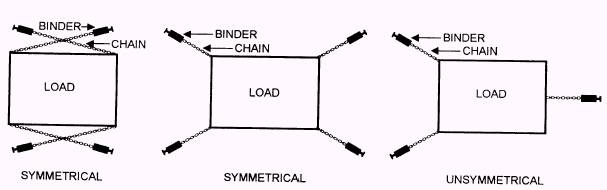 Figure 7-33.-Symmetrical tie-down pattern. should be shaped to fit snugly against the cargo and should be secured to the deck of the trailer to prevent the cargo from moving. Bracing is also used to prevent movement of the cargo. Bracing is placed from the upper part of the cargo to the floor and/or walls of the cargo compartment. Because cargo loads have a tendency to shift, a common rule of thumb is to inspect the cargo and the securing devices before departing and within 25 miles after beginning a trip. Always check the cargo and securing devices as often as necessary during a trip to keep the load secured. Inspect the cargo and securing devices after you have driven for 3 hours or 150 miles and after every break taken during the trip. LOOSE MATERIAL.- Dump trucks are often used to haul loose material. Soil, aggregate, and sand are examples of cargo that is categorized as loose material. When you are operating dump trucks, be sure that no part of the load can fall off your truck when making turns. You should stop loading before it reaches the top of the side or end gate. Dirt spilled in curves and turns creates driving hazards and should be cleaned up daily. Another hazard created by loose material is a broken windshield caused by aggregate falling from dump trucks. NOTE: In some states and on some deployment locations, it is a requirement that all loose material loads carried in dump trucks must be covered. BUILDING MATERIAL.- When loading steel, lumber, or anything that must be unloaded with a forklift or crane, you should place 4 by 4 timbers or pallets under the load. This helps get forks or cables in and out from under the load RESTRAINTS.- Loads must be secure enough to
