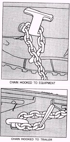 Figure 7-34.-Chains properly hooked on the equipment and trailer tie-down eyes. When securing loads, place the tie-downs in a symmetrical pattern, as shown in figure 7-33. A tie-down assembly must have a safe working load (SWL) of 1 1/2 times the weight of the load to be restrained. For example, to restrain a crawler tractor weighing 55,000 pounds, you need a tie-down assembly for 82,500 pounds (55,000 x 1.5 = 82,500). This means you need eight 1/2-inch chains with an SWL of 11,000 pounds each and eight binders with 1/2-inch hooks. On flatbed or lowboy trailers without sides, cargo must be secured to the trailer to keep it from shifting and falling off. In closed van trailers, tie-downs can also prevent cargo from shifting that may affect the handling of the vehicle. Tie downs must be of the proper type and strength. The combined strength of all tie-downs must be strong enough to lift 1 1/2 times the weight of the piece of cargo tied down. |