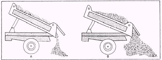 Figure 7-38.-Dumping the load. reading and understanding the operator's manual for the model of dump truck you are assigned to operate. This section covers the basic characteristics and operations of dump trucks. CHARACTERISTICS A typical dump truck is equipped with a dump body that is hinged to the rear of a subframe which is mounted directly on the truck chassis. Dump bodies range in structural strength and size to support different operations. That is why it is important that the operator knows the design and capacity of the dump truck assigned to operate. You do not want to haul quarry rock in a dump body designed to haul and heat asphalt. The quarry rock can damage the dump body and render it useless for asphalt operations. The components of a dump truck body are shown in figure 7-36. A hydraulic hoist assembly is used to raise and lower the dump truck body. The hydraulic pump is driven by a propeller shaft connected to the power takeoff (PTO). A variety of ways are used to engage the PTO on dump trucks used in the NCF; therefore, consult the operator's manual for specific instructions on how to engage the PTO and hoist assembly. |