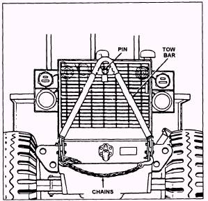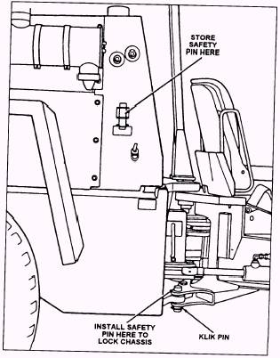 Figure 8-2.-4K rough-terrain (RT) forklift. from articulating; therefore, the forklift cannot be steered. Failure to disengage the pin may cause serious injury or death. The 4k forklift can be towed rearward using the tow bar (fig. 8-4) located on the rear of the vehicle. The towing procedure for the 4K (RT) forklift is as follows: 1. Remove the pin securing the tow bar in the vertical position and lower the tow bar into the towing position and attach it to the pintle hook on the towing vehicle. 2. Disconnect the hook end of the two safety chains from the forklift and attach them to the towing vehicle. 3. Push the axle disconnect lever (fig. 8-5) to the right toward the front chassis to disconnect the axles for towing. The axle disconnect lever controls the engagement of the transmission output shaft to the front and rear axles. To engage the axles for operation, you push the lever to the left towards the rear of the vehicle. 4. Open the steering bypass valve (fig. 8-6) by turning it counterclockwise fully.