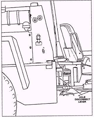 Figure 8-5.-Axle disconnect lever. The steering bypass valve allows the front chassis to pivot freely on the rear chassis when towing the forklift. For normal steering control, close the valve by turning the knob clockwise fully.