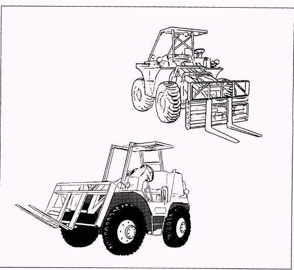 Figure 8-7.-6K rough-terrain (RT) forklifts. transmission for smooth acceleration, deceleration, and easy handling. LIFT-KING FORKLIFT The NCF has two types of lift-king forklifts (fig. 8-8) rated at 12K and 16K. These two models provide a lifting capacity of 12,000 to 16,000 pounds at a 48-inch load center to a height of 120 inches. The lift-king forklift is equipped with forklift oscillation, load side shift, lift interrupt, fork positioning, four-wheel and two-wheel-crab steering selection, and counterweight lowering. The lift-king forklift is equipped with an inching control that is controlled by the inching pedal located to the left of the brake pedal. Depressing the inching pedal slightly varies the amount of oil pressure in the transmission, allowing the forklift to be "inched" along slowly while the engine is operated at high speed for fast lifts. When the inching pedal is depressed fully, the transmission is disengaged. NOTE: Do not use the inching pedal as a clutch and under high-torque requirements. The mast of the lift-king forklift is equipped with a lift interrupt device that prevents lifting the fork assembly above 43 inches from the ground. This is a safety device to prevent raising the mast while inside an aircraft and causing extensive damage. To lift loads higher than 43 inches, you must press the red-colored manual lift interrupt override button. This button allows the forks to attain their maximum lift height when required. The lift-king forklift is air transportable; however, where the load per axle weight cannot be exceeded, the front carriage assembly and rear counterweight must be removed. The procedure of carriage removal is as follows: 1. Lower the forks to the ground and tilt the mast slightly forward to produce slack in the lifting chains. 2. Remove the lower chain anchor pins. 3. Raise the mast above the carriage rollers and back the forklift out, leaving the forks and carriage on the ground. NOTE: For reinstallation, the procedures are simply reversed. The procedure for counterweight removal is as follows: 1. Remove the two bolts (one on each side of the forklift) that secures the counterweight (fig. 8-9). 2. Lower the counterweight lifting arm to rest the counterweight on the ground (hydraulic control lever is located in the back of the operator's cab to the right of the seat). 3. Remove the pin from the shackle to disconnect the arm from the counterweight. Remember: Store the bolts and the pin in the toolbox. 4. Drive the forklift away from the counterweight. NOTE: When the lift-king forklift is transported on a tractor-trailer, seal the exhaust pipe to prevent autorotation of the turbocharger turbine due to wind velocity. Failure to do so can result in damage to the turbine bearing due to lack of lubrication.
