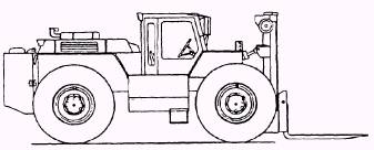 6K ROUGH-TERRAIN (RT) FORKLIFTS The 6K rough-terrain (RT) forklifts (fig. 8-7) are all-wheel drive, all-wheel steer materials-handling equipment capable of lifting 6,000-pound loads to a height of 200 inches. The 6K (RT) forklift is designed to handle loads over rough terrain consisting of unprepared or unstabilized surfaces, such as beaches, deep sand, snow, ice, or mud. The 6K (RT) is used primarily for loading and unloading flatbed trailers, landing craft, and other types of cargo vessels. A hydraulic-operated forklift mechanism, mounted on the extreme front of the 6K (RT) forklift, provides for lifting, reaching, tilting, and sliding loads during material-handling operations. A unique design feature of the rough-terrain forklift is an oscillating hydraulic cylinder that allows the rotation of the forklift frame about its longitudinal axis when being operated over rough terrain. The operator controls the rotation by manipulating the control that activates the oscillating hydraulic cylinder. The 6K (RT) forklift is also equipped with a power shift