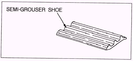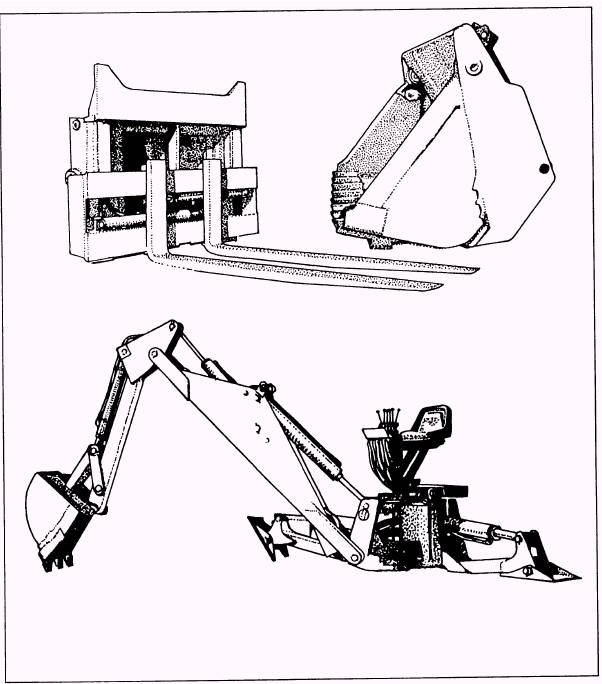 Figure 9-1 . -Rubber-tired front-end loader. enables it to operate in areas where wheeled frontend loaders cannot go. The crawler-mounted frontend loader (fig. 9-2) has a lower speed than a rubber-tired front-end loader, and this decreases its mobility; however, the crawler-mounted frontend loader can be operated on side slopes of up to 35 percent and on front slopes of up to 60 percent. The hydraulic system provides positive control of the front-end loader, and the crawler tracks are normally semi-grouser shoes (fig. 9-3) that permit it to work on firm ground with little damage to the surface. ATTACHMENTS Attachments contribute to the efficient performance of front-end loaders. Some loaders used in the NCF are procured with a bucket, forklift, and backhoe attachments (fig. 9-4). These attachments allow the front-end