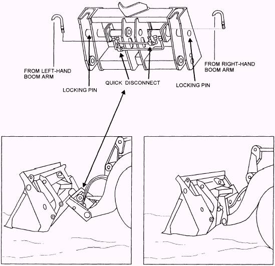 Figure 9-5.-Attachment connection. loader to be an ideal piece of equipment for construction projects, saving the need for numerous pieces of equipment that can be used elsewhere. Quick-disconnect hydraulic hose fittings and hydraulic controlled locking pins permit these attachments to be changed easily, as shown in figure 9-5. |