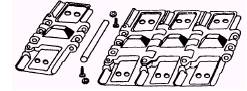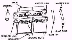 Figure 9-57.-Track links and bolt-on shoes. The other type of track is the roller chain with bolt-on shoes. Each linked pair is fastened together with a bushing at one end. A pin goes through the bushing and holds the overlapping ends of the next pair of links (fig. 9-57). The track is assembled on a hydraulic press that is able to force the slightly oversized pins and bushings into the links that very seldom work apart in service. The pins turn easily in the bushing, providing the necessary hinge action. The propel, traction, or travel drive may come from a pair of live axles set across the center of the car body or a pair of reversible hydraulic motors fastened to the track frame. |