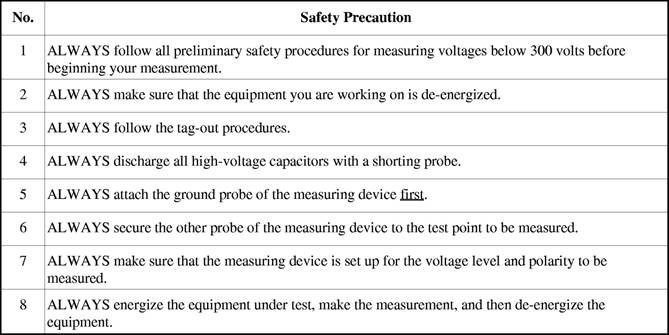 ELECTROSTATIC DISCHARGE PRECAUTIONS Electrostatic discharge (ESD) can destroy or damage many electronic components, including integrated circuits (ICs) and discrete semiconductor devices. Since certain devices are more susceptible to ESD damage than others, warning symbols, shown in figure 3-1, are now used to identify ESD-sensitive (ESDS) items. The widespread use of integrated circuits led to the development of special training courses in miniature/micro miniature (2M) circuit repair. Certified 2M technicians are trained in procedures for reducing the causes of ESD damage. The procedures are similar for all levels of maintenance. If you are certified in 2M repair, you should follow the protective measures in table 3-6 to help prevent ESD damage. Remember, although many sources of electrostatic charge are of little consequence during most daily activities, they become extremely important when you work with ESD material. If you are not certified in 2M repair, do not attempt to repair any of these circuits. For further information on handling ESD materials, refer to Introduction to Microelectronics, Navy Electricity and Electronic Training Series (NEETS), Module 14, NAVEDTRA 172-14-00-84. Q3. What is the FIRST step in taking voltage measurements below 300 volts? Q4. What is the major difference between using a test probe to measure a voltage above 300 volts and using it to measure a voltage of 300 volts or less? Q5. What dangerous effect to electronic components are EDS precautions designed to reduce or eliminate? ELECTROMAGNETIC RADIATION HAZARDS The electromagnetic spectrum encompasses everyday uses from commercial power to medical Table 3-5.-Safety Precautions For Measuring Voltages Above 300 Volts