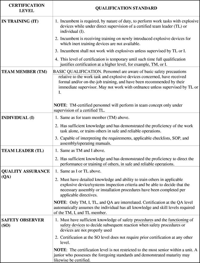 CERTIFICATION When you are qualified and recommended for certification, you will be issued final certification by the commanding officer, the officer in charge, or the designated head of the certification board. An appropriate entry will be made in your training record and service record. Next, let's find out who must qualify and certify for what positions of responsibility. The following personnel require individual qualification and certification: 1. Personnel whose duties require that they individually handle, inspect, package, unpack, assemble, disassemble, test, fuze, load or download, stow, arm or de-arm explosives or explosive devices must be qualified and certified for such tasks. Personnel assigned as safety observers for explosive operations, and those who inspect explosive operations for quality assurance purposes must also be qualified and certified. Supervisors of explosive operations and members of the command-appointed certification boards must also be individually certified for the evolutions that they may supervise or observe for qualification purposes. The only exception to this provision is that supervisors of explosives handling teams involved in handling explosives/hazardous materials with power-operated handling equipment need not themselves be qualified as operators. They must, however, be certified as team leaders for the explosive operations being conducted. 2. All operators of power-operated handling equipment (hoists, winches, cranes, forklifts, and so forth) used in transporting, loading, or handling ammunition, explosives, and other hazardous materials must be both certified and licensed as ground support equipment and/or materials handling equipment operators. Civilian personnel who operate these types of