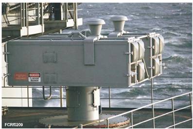 Figure 2-9.-Mk 29 box launcher for SEASPARROW missiles. MK 91 FIRE CONTROL SYSTEM The Mk 91 NATO SEASPARROW Guided Missile Fire Control System (GMFCS) integrates the Mk 157 NATO SEASPARROW Surface Missile System (NSSMS) into the Ship Self Defense System (SSDS) to provide an additional layer of ship missile defense. In this system, the Firing Officer Console and Radar Set Consoles are combined into a single Advanced Display System Console (AN/UYQ 70); the Signal Data Processor is modified; the Mk 157 Computer Signal Data Converter and the System Evaluation and Trainer (SEAT) are eliminated; and the microprocessor circuitry within the SSDS electronics is upgraded. This eliminates the limited input-output channel and computer processing deficiencies resident in the older Mk 57 NSSMS. The radar associated with the Mk 91 Fire Control System includes the Mk 95 illuminator, Mk 23 Target Acquisitioning System, and the AN/SPQ-9 series radar. The Mk 95 illuminator is used exclusively with the NATO SEASPARROW GMFCS. It is an X-band tracker-illuminator on a Mk 78 director and works with the Mk 23 TAS. The Mk 91 Fire Control System and its associated radar systems are found on Spruance class destroyers, carriers, LHDs, AOEs, AORs, and TARAWA class amphibious assault ships. See figure 2-10 for the various weapons systems and radar associated with the Mk 86 and Mk 91 fire control systems on a SPRUANCE class destroyer. MK 92 FIRE CONTROL SYSTEM RADAR The Mk 92 Fire Control System (FCS) provides FFG-7 class frigates (Figure 2-11) and other surface combatants with a fast reaction, high firepower, all-weather weapons control system for use against air and surface targets. The Mark 92's surface and air surveillance capability gives highly accurate gun and missile control against air and surface targets. The Mark 92 fire control system, an American version of the WM-25 system designed in the Netherlands, was approved for service use in 1975. Introduction to the fleet and follow-on test and evaluation began in 1978. In 1981, an aggressive program to improve performance and reliability of the Mk 92 fire control system in clutter and electronic counter-measure environments was launched, with an at-sea evaluation aboard the USS Estocin completed in