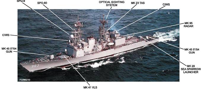 Figure 2-10.-Weapons and sensors on SPRUANCE class destroyer.