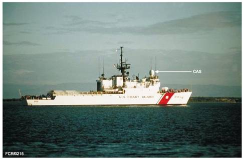 Figure 2-15.-WMEC-910 Coast Guard Cutter Thetis with Mk 92 CAS. figure 2-16). All associated electronics for radar operations are enclosed within either the radome or the Electronics Enclosure (called the ELX). CIWS is operated remotely from either a Local Control Panel (LCP) or the Remote Control Panel (RCP) located in the Combat Information Center (CIC). It has two primary modes of operation: automatic and manual. In the automatic mode, the computer program determines the threat target, automatically engages the target, and performs the search-to-kill determination on its own. In the manual mode, the operator fires the gun after CIWS has identified the target as a threat and has given a "recommend fire" indication. CIWS was developed in the late 1970's to defend against anti-ship cruise missiles. However, as the sophistication of cruise missiles increased, so did the sophistication of CIWS. Major changes to CIWS are referred to as "Block" upgrades. The first upgrade, known as "Block 0", incorporated a standard rotating search antenna. Limitations of elevation in Block 0 lead to the next upgrade, Block 1. Block 1 provided improved elevation coverage and search sensitivity by using a phased-array antenna. A minor upgrade to Block 1, known as Block IA, improved the processing power of the computer by incorporating a new high-order language. This upgrade gave CIWS the ability to (1) track maneuvering targets and (2) work with multiple weapons coordination. The next upgrade, Block 113, enabled CIWS to engage surface targets. This upgrade is known as the Phalanx Surface Mode (PSUM). A special radar, Forward-Looking Infrared Radar (FLIR), was added to CIWS to detect small surface targets (i.e., patrol/torpedo boats) and low, slow, or hovering aircraft (i.e., helicopters). This radar is mounted on the side of the radome structure. FUR can also help the radar system engage anti-ship cruise missiles. To detect targets day or night, CIWS Block 1B uses a thermal imager and advanced electro-optic angle tracking.