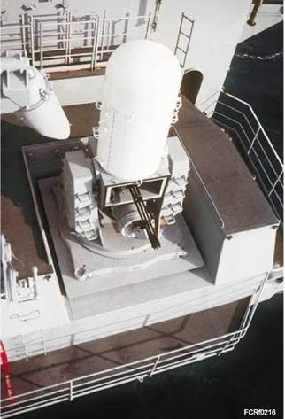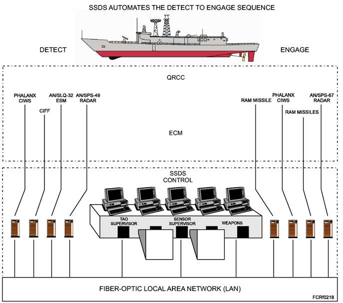 Figure 2-16. -CIWS radome with search and track radar. SHIP SELF-DEFENSE SYSTEM (SSDS) The principal air threat to US naval surface ships is a variety of highly capable anti-ship cruise missiles (ASCMs)(figure 2-17). These include subsonic (Mach 0.9) and supersonic (Mach 2+), and low altitude ASCMs. Detection, tracking, assessment, and engagement decisions must be made rapidly to defend against these threats, since the time from when an ASCM is initially detected until it is engaged is less than a minute. SSDS is designed to accomplish these defensive actions. SSDS, consisting of software and commercial off-the-shelf (COTS) hardware, integrates and coordinates all of the existing sensors and weapons systems aboard a non-AEGIS ship to provide Quick Reaction Combat Capability (QRCC). (It will eventually be installed on board most classes of non-AEGIS ships.) SSDS (fig. 2-18), by providing a Local Area Network (LAN), LAN access units (LAUs), special computer programs, and operator stations, automates the defense process, from the