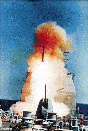 Figure 2-17.-Missile launch from an AEGIS class cruiser. detect sequence through the engage sequence. This provides a quick response, multi-target engagement capability against anti-ship cruise missiles. The entire combat system, including the sensors and weapons, is referred to as Quick Reaction Combat Capability (QRCC), with SSDS as the integrating element. Although SSDS broadens the ship's defensive capability, it is not intended to improve the performance of any sensor or weapon beyond its stand-alone performance. The primary advantage SSDS brings to the combat systems suite is the ability to coordinate both hard kill (gun and missile systems) and soft kill (decoys such as chaff) systems and to use them to their optimum tactical advantage. The following systems represent the SSDS interfaces for a non-AEGIS ship: AN/Air Search Radar AN/Surface Search Radar AN/Electronic Warfare System Centralized Identification Friend or Foe (CIFF) Rolling Airframe Missile (RAM)