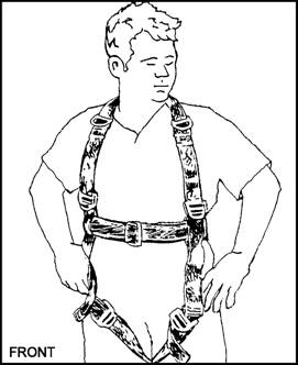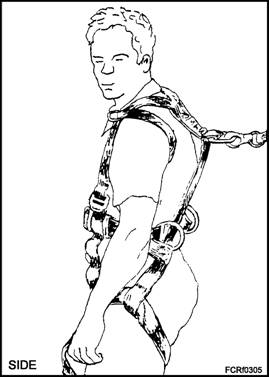 SAFETY HARNESS For your own safety, you should wear an approved parachute-type safety harness (fig. 3-5) with a safety lanyard and a tending line (as required) with double locking snap hooks whenever you work aloft. (The lineman-type safety belt is no longer authorized for use.) Safety harnesses should be checked periodically as prescribed by the Planned Maintenance System. Place the tools that you will use on the job in a canvas bag and haul the bag up with a line to the job location. To guard against dropping tools and seriously injuring someone, tie the tool you are using to your safety harness with a piece of line.