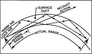 RADAR SYSTEM ACCURACY To be effective, a radar system must provide accurate indications. That is, it must be able to determine and present the correct range, bearing, and, in some cases, altitude of an object. The degree of accuracy is primarily determined by two factors: the resolution of the radar system and existing atmospheric conditions. Range resolution is the ability of a radar to distinguish between two targets on the same bearing, but at slightly different ranges. The degree of range resolution depends on the width of the transmitted pulse, the types and sizes of the targets, and the efficiency of the receiver and the indicator. Bearing Resolution Bearing, or azimuth, resolution is the ability of a radar system to separate objects at the same range, but at slightly different bearings. The degree of bearing resolution depends on the radar's beamwidth and the range of the targets. The physical size and shape of the antenna determines beamwidth. Two targets at the same range must be separated by at least one beamwidth to be distinguished as two objects. Atmospheric Conditions Several conditions within the atmosphere can have an adverse effect on radar performance. A few of these are temperature inversion, moisture lapse, water droplets, and dust particles. The temperature and moisture content of the atmosphere normally decrease uniformly with an increase in altitude. However, under certain conditions the temperature may first increase with height and then begin to decrease. Such a situation is called a temperature inversion. An even more important deviation from normal may exist over the ocean. Since the atmosphere close to the surface over large bodies of water may contain more than a normal amount of moisture, the moisture content may decrease more rapidly at heights just above the sea. This effect is referred to as moisture lapse. Either temperature inversion or moisture lapse, alone or in combination, can cause a large change in the refraction index of the lowest few-hundred feet of the atmosphere. The result is a greater bending of the radar waves passing through the abnormal condition. This increase in bending, referred to as ducting, may greatly affect radar performance. The radar horizon may be extended or reduced, depending on the direction in which the radar waves are bent. The effect of ducting is illustrated in figure 1-3. Water droplets and dust particles diffuse radar energy through absorption, reflection, and scattering. This leaves less energy to strike the target, so the return echo is smaller. The overall effect is a reduction in