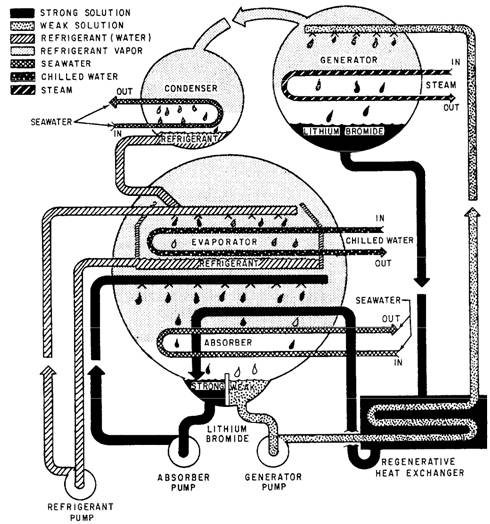 Figure 10-21.-Basic absorption cycle. known as a WEAK solution. Here, in the generator section of the plant, the weak solution is rejuvenated for reuse as a STRONG solution. The generator pump pumps the weak solution from the weak solution section of the absorber up to the generator. In the generator, the weak lithium bromide solution is sprayed out over steam tubes that heat the solution and drive the water vapor out of the solution. The strong solution thus produced flows back into the absorber for reuse. The water vapor driven out of the solution flows from the generator into the condenser where it is condensed by circulating seawater for reuse as a refrigerant. The condensed vapor flows into the evaporator and down to the refrigerant tray. A regenerative heat exchanger is provided in the system for the lithium bromide solution. The weak solution must be heated to drive out the water vapor; the strong solution must be cooled to absorb water vapor. The regenerative heat exchanger aids in this process by cooling the strong solution and preheating the weak solution in the cycle. Seawater (condensing) flow is provided through the absorber section. It cools the strong solution returning from the generator and removes the heat produced as the lithium bromide solution absorbs the water vapor. The outlet seawater from the absorber is the inlet water for the condenser. The absorber pump and the generator pump are driven by a common electric motor. Therefore, the two pumps are referred to cumulatively as the absorber/generator pump. A purge system (not shown) consists of a pump, an eductor, and a purge tank. The system is provided with the lithium bromide absorption system to keep air and noncondensables out of the evaporator/absorber shell.