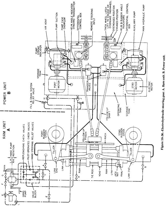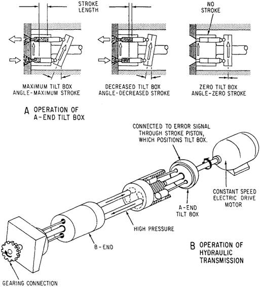 ELECTROHYDRAULIC DRIVE MACHINERY Hydraulic units drive or control steering gears, windlasses, winches, capstans, airplane cranes, ammunition hoists, and distant control valves. In this part of the chapter, you will learn about some of the hydraulic units that will concern you. The electrohydraulic type of drive operates several different kinds of machinery better than other types of drives. Here are some of the advantages of electrohydraulic machinery. Tubing, which can readily transmit fluids around corners, conducts the liquid which transmits the force. Tubing requires very little space. The machinery operates at variable speeds. Operating speed can be closely controlled from minimum to maximum limits. The controls can be shifted from no load to full load rapidly without damage to machinery. ELECTROHYDRAULIC SPEED GEAR. An electrohydraulic speed gear is frequently used in electrohydraulic applications. Different variations of the basic design are used for specific applications, but the operating principles remain the same. Basically, the unit consists of an electric motor-driven hydraulic pump (A-end) and a hydraulic motor (B-end). The B-end (fig 10-37) is already on stroke and is rotated by the hydraulic force of the oil acting on the pistons. Movement of the pistons' A-end is controlled by a tilt box (also called a swash plate) in which the socket ring is mounted, as shown in part A of figure 10-37. The length of piston movement, one way or the other, is controlled by movement of the tilt box and by the amount of angle at which the tilt box is placed. The length of the piston movement controls the amount of fluid flow. When the drive motor is energized, the A-end is always in motion. However, with the tilt box in a neutral or vertical position, there is no reciprocating motion of the pistons. Therefore, no oil is pumped to the B-end. Any movement of the tilt box, no matter how slight, causes pumping action to start. This causes immediate action in the B-end because force is transmitted by the hydraulic fluid. When you need reciprocating motion, such as in a steering gear, the B-end is replaced by a piston or ram. The force of the hydraulic fluid causes the movement of the piston or ram. The tilt box in the A-end is controlled locally (as on the anchor windlass) or remotely (as on the steering gear). ELECTROHYDRAULIC STEERING GEAR The steering gear transmits power from the steering engine to the rudder stock. The steering gear frequently includes the driving engine and the transmitting mechanism. Many different designs of steering gear are in use, and they all operate on the same principle. One type of
