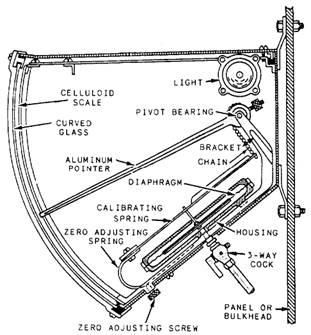 Figure 11-8.-Diaphragm gauge. Many differential pressure gauges are of the bellows type. In some designs, one pressure is applied to the inside of the bellows, and the other pressure is applied to the outside. In other designs, a differential pressure reading is obtained by opposing two bellows in a single case. Bellows elements are used in various applications where the pressure-sensitive device must be powerful enough to operate not only the indicating pointer but also some type of recording device. DIAPHRAGM GAUGES Diaphragm gauges are very sensitive and give reliable indication of small differences in pressure. Diaphragm gauges are generally used to measure air pressure in the space between the inner and outer boiler casings. Figure 11-8 shows the indicating mechanism of a diaphragm gauge. This mechanism consists of a tough, pliable, neoprene rubber membrane connected to a metal spring that is attached by a simple linkage system to the gauge pointer. One side of the diaphragm is exposed to the pressure being measured, while the other side is exposed to the atmosphere. When pressure is applied to the diaphragm, it moves and, through a linkage system, moves the pointer to a higher reading on the dial. When the