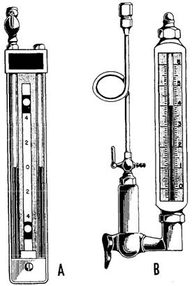 Figure 11-9.-A. Standard U-tube manometer. B. Single-tube manometer. pressure is lowered, the diaphragm moves the pointer back toward the zero point. |