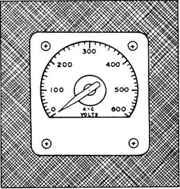 Figure 11-16.-An ac voltmeter. then converted to 0 to 10 volts dc, which is proportional to the parameters being sensed. Electrical values, such as power and current, are measured and displayed at ship's service switchboards. Normally, shipboard repair is not done on switchboard meters. If you suspect the switchboard meters are out of calibration or broken, you should have them sent to a repair facility. You can find more information on the theory of operation of these meters in the Navy Electricity and Electronics Training Series (NEETS), Module 3, Introduction to Circuit Protection, Control, and Measurement, NAVEDTRA 172-03-00-79. VOLTMETERS Both do and ac voltmeters determine voltage the same way. They both measure the current that the voltage is able to force through a high resistance. This resistance is connected in series with the indicating mechanism or element. Voltmeters installed in switchboards and control consoles (fig 11-16) all have a fixed resistance value. Portable voltmeters, used as test equipment, usually have a variable resistance. For both installed and portable voltmeters, resistances are calibrated to the different ranges that the meters will display. The normal range for the switchboard and electric plant meters is 0 to 600 volts.