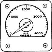 Figure 11-17.-An ac ammeter. AMMETERS Ammeters are used to measure the amount of current passing through a conductor (fig 11-17). Different types of ammeters are used to measure either ac or dc. Ammeters that are designed specifically to indicate ac will also measure dc, but with a lower degree of accuracy. Ammeters must be connected in series with the circuit to be measured. For this reason, installed ammeters are constructed so that they do not handle the current that passes through the conductor being measured. Since ammeters cannot handle the high switchboard current, the switchboard ammeters operate through current transformers. This arrangement isolates the instruments from the line potential. In its secondary, the current transformer produces a definite fraction of the primary current. This arrangement makes it possible for you to measure large amounts of current with a small ammeter. CAUTION The secondary of a current transformer contains a dangerous voltage. Never work around or on current transformers without taking proper safety precautions. |
