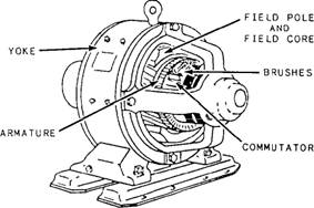 GENERATOR TYPES AND DRIVES A large amount of electricity is required aboard ship to power machinery that supplies air, water, food, and other services. Communications between the various parts of a ship also depend on the availability of electric power. The generator is the power source for the ship's electrical system. A generator operates most efficiently at its full-rated power output, and it is not practical to have one large generator operating constantly at reduced load. Therefore, two or more smaller generators that are operated at high load are installed aboard ship. Two or more generators are usually installed aboard ship for another reason. If one generator is shut down because of damage or scheduled maintenance, there is still a source of power for lighting until the defective generator has been repaired. In addition, generators are widely spaced in the engineering spaces to decrease the chance that all electrical plants would be disabled by enemy shells. Most generators used aboard ships are ac generators. However, since some do generators are still in service, we will briefly discuss do generators before moving on to ac generators. DC GENERATORS AND EXCITERS A do generator is a rotating machine that changes mechanical energy to electrical energy. There are two essential parts of a do generator: 1. The yoke and field windings, which are stationary, and 2. the armature, which rotates. In the past, ship's service generators produced direct current. At present, practically all ships have 450-volt, 60-hertz (Hz), ac ship's service and emergency generators. The do generators used in Navy installations for ship's service or for exciters operate at either 120 volts or 240 volts. The power output depends on the size and design of the do generator. A typical do generator is shown in figure 12-1. AC GENERATORS AC generators are also called alternators. In an ac generator, the field rotates, and the armature is stationary. To avoid confusion, the rotating members of do generators are called armatures; in ac generators, they are called rotors. The general construction of ac generators is somewhat simpler than that of do generators. An ac generator, like a do generator, has magnetic fields and an armature. In a small ac generator the armature revolves, the field is stationary, and no commutator is required. In a large ac generator, the field revolves and the armature is wound on the stationary member or stator. The principal advantages of the revolving-field generators over the revolving-armature generators are as follows: The load current from the stator is connected directly to the external circuit without using a commutator.