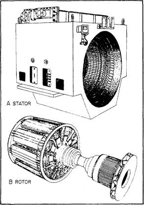 Figure 12-2.-Low-speed, engine-driven alternator. Only two slip rings are necessary to supply excitation to the revolving field. The stator winding is not subjected to mechanical stresses that are due to centrifugal force. The ac generators (alternators) used by the Navy are divided into two classes: (1) low-speed, engine-driven alternators and (2) high-speed, turbine-driven alternators. The low-speed, engine driven alternator fig. 12-2 has a large diameter revolving field, with many poles, and a stationary armature. The stator (view A) contains the armature windings. The rotor (view B) consists of protruding poles on which the do field windings are mounted. The high-speed alternator may be either steamer gas-turbine driven. The high-speed, turbinedriven alternator is connected either directly or through gears to a steam turbine. The