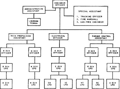 Figure 1-1.-Typical engineering department. *Completion of all repairs within the capacity of the shops in the engineering department For more detailed information about the duties and responsibilities of the engineer officer, refer to the U.S. Navy Regulations, the Engineering Department Organization and Regulations Manual (EDORM), and the SORM. Assistants to the Engineer Officer The engineer officer is assigned assistants for main propulsion, electrical, damage control, and other specific duties that are required for the proper performance of the functions of the engineering department. The engineer officer must make sure the assistants perform their assigned duties. In the following paragraphs, we will describe the duties of the administrative assistant, training officer, fire marshal, gas-free engineer, MPA, electrical officer, and DCA. ADMINISTRATIVE ASSISTANT.- The department administrative assistant functions as an aide to the engineer officer in the details of administration. The responsibilities and duties of the department administrative assistant are as follows: Supervise the operation of the department administrative office; this includes the upkeep of assigned office spaces and the care and maintenance of office equipment. Screen all department incoming correspondence and initiate required action; also, screen and ensure correct preparation of all outgoing correspondence. Assist in the preparation of all department directives and exercise control over their issuance. Supervise the maintenance of department records and maintain a tickler file on all required reports. Coordinate the preparation of the department daily watch bill. Assign tasks to, and evaluate the performance of, department yeomen and other enlisted personnel assigned to the department office. In an engineering department without an administrative assistant billet, the engineer officer may delegate the duties of such a billet to any competent person. TRAINING OFFICER.- The duties of a department training officer are delegated by the engineer officer to an assistant. Some of these duties include the followmg: Develop a department training program in support of the training objectives of the ship. Carry out approved training plans and policies within the department. Coordinate and assist in the administration of division training programs within the department. This includes supervision of the preparation of training materials and review of curricula, training courses, and lesson plans. It also includes assisting in the selection and training of instructors, observation of instruction given at drills, on watch, on station, and in the classroom. It further includes procurement of required training aids and devices. Maintain department training records and training reports. Disseminate information concerning the availability of fleet and service schools. Requisition training supplies and materials. FIRE MARSHAL.- The fire marshal works under the engineer officer and the DCA and is responsible for the maintenance and readiness of the ship's fire-fighting equipment. The fire marshal is also responsible for the prevention and elimination of fire hazards on the ship. GAS-FREE ENGINEER.- The duties and responsibilities of the gas-free engineer are described in Naval Ships' Technical Manual, chapter 074, volume 3, "Gas-Free Engineering." Briefly, the gas-free engineer tests and analyzes the air in sealed compartments or voids that are being opened for inspection. The engineer determines whether such spaces are safe for personnel to enter without danger of poisoning or suffocation. The engineer also determines whether it is safe to perform welding or cutting within or in the vicinity of such spaces. Such hot work is dangerous and can cause fires and explosions. MAIN PROPULSION ASSISTANT.- The responsibilities of the MPA are as follows: Operation, care, and maintenance of the ship's propulsion machinery and related auxiliaries Care, stowage, and use of fuels and lubricating oils Preparation and care of the Engineering Log and the Engineer's Bell Book Preparation of operation and maintenance records and procedures The MPA also has the responsibility as division officer for the boiler and machinery divisions. These divisions are discussed in the following paragraphs. Boiler (B) Division.- The B division operates the boilers and the fireroom auxiliary machinery. If you are assigned to this division, your work station may be in a fireroom. The firerooms are usually located midships on the lower level. There may be as many as eight firerooms, depending on the size and type of ship. Ships with only one fireroom will have two boilers. They are installed either facing each other or side by side. The boilers are arranged so any number of them supply steam to the ship's engines. The firerooms are separated by watertight bulkheads. This allows any fireroom to be sealed off in case of a casualty. The ship can operate on the remaining boilers. On your first trip through the fireroom, you will notice many sizes of pipes and valves. These lines (pipes) carry steam, water, fuel oil, and air. You will become familiar with a few of them at a time. Gradually, you will learn all their purposes and functions. The lines that carry steam or water are covered by insulation and lagging. This is done to ensure personnel safety and to prevent heat loss and condensation. Stencils on the lines show the fluid carried and the direction of flow. During your training, you will trace these lines from one unit to another throughout each system. The ship's blueprints and drawings will help you trace out systems in the engineering plant. Machinery (M) Division.- The M division is responsible for the safe operation of the main engines, reduction gears, shafting, bearings, and all associated auxiliary machinery that supports this equipment. When assigned to this division, you will work in one of the engine rooms. The engine rooms are generally located immediate
