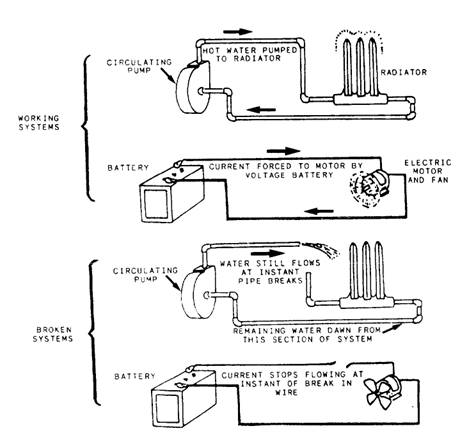 Figure 2-3.-Different characteristics of current and water. broken pipe, but current cannot flow out of a broken wire. When a wire is broken, the force of the voltage is removed from the motor, as shown in Figure 2-3. The circulating pump in the working system creates a force that moves hot water through the pipes and radiator. The battery creates a force that moves current through the wires and causes the motor to run. The wire and pipe are broken open in the broken system. In these instances, the circulating pump forces water to flow out of the pipe, but even though the battery still creates a voltage force, current does not flow out of the wire. You will find additional information on the basic principles of electricity in the NEETS, module 1, NAVEDTRA 172-01-00-88, chapter 1. OHM'S LAW In the early part of the 19th century, George Simon Ohm proved by experiment that a precise relationship exists between current, voltage, and resistance. This relationship is called Ohm's law and is stated as follows: I = E/R, where: I = current in amperes, E = voltage in volts, and R = resistance in ohms. As stated in Ohm's law, current is inversely proportional to resistance. This means, as the resistance in a circuit increases, the current decreases proportionately. In the equation I = E/R, if any two quantities are known, the third one can be determined. NEWTON'S LAWS Sir Isaac Newton was an English philosopher and mathematician who lived from 1642 to 1727 A.D. He was the formulator of the basic laws of modern philosophy concerning gravity and motion. Before we discuss motion and other related factors, you should be familiar with Newton's laws. These laws are the bases for the theories of physics that we describe in the following sections. |