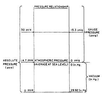 Figure 2-11.-Relationships among gauge pressure, atmospheric pressure, vacuum, and absolute pressure. the word pressure, the relationships among gauge, atmospheric, vacuum, and absolute pressures are shown in figure 2-11 GAUGE PRESSURE is the pressure actually shown on the dial of a gauge that registers pressure relative to atmospheric pressure. An ordinary pressure gauge reading of zero does not mean there is no pressure in the absolute sense; rather, it means there is no pressure in excess of atmospheric pressure. ATMOSPHERIC PRESSURE is the pressure exerted by the weight of the atmosphere. At sea level, the average pressure of the atmosphere is sufficient to hold a column of mercury at the height of 76 centimeters or 29.92 inches. Since a column of mercury 1 inch high exerts a pressure of 0.49 pound per square inch (psi) at its base, a column of mercury 29.92 inches high exerts a pressure that is equal to 29.92 x 0.49 or about 14.7 psi. Since we are dealing now in absolute pressure, we say that the average atmospheric pressure at sea level is 14.7 pounds per square inch absolute (psia). It is zero on the ordinary pressure gauge. Notice, however, that the figure of 14.7 psia represents the average atmospheric pressure at sea level; it does not always represent the actual pressure being exerted by the atmosphere at the moment a gauge is being read. Since fluctuations from this standard are shown on a barometer (an instrument used to measure atmospheric pressure), the term barometric pressure is used to