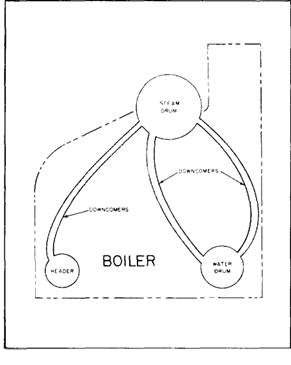 WATER DRUM The water drum is larger than the header, but both are smaller than the steam drum. The water drum equalizes the distribution of water to the generating tubes. Both the water drum and the header collect the deposits of loose scale and other solid matter present in the boiler water. Both the drum and the header have bottom blowdown valves. When these valves are opened, some of the water is forced out of the drum or header and carries any loose particles with it. DO NOT OPEN THE BOTTOM BLOWDOWN VALVES ON A STEAMING BOILER. Opening these valves will interrupt the circulation of the steam cycle. DOWNCOMER TUBES At each end of the steam drum are a number of large tubes fig 4-3 that lead to the water drum
