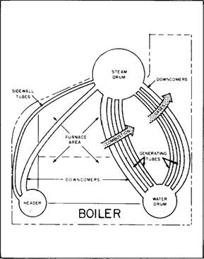 Figure 4-3.-Downcomer tubes. and sidewall header. These tubes are the downcomers through which water flows downward from the steam drum to the water drum and the header. The downcomers range in diameter from 3 to 8 inches. GENERATING TUBES Many tubes link the steam drum to the water drum and to the header. The tubes that lead from the water drum to the steam drum are the generating tubes figure 4-4. They are arranged in the furnace so the gases and the heat of combustion can flow around them. The large arrows in figure 4-4 show the direction of flow of the combustion gases. The generating tubes are made of steel that is strong enough to withstand the high pressures and temperatures within the boiler. In most boilers these tubes are usually 1 to 2 inches in diameter, but some may be 3 inches. These small tubes present a large surface area to absorb furnace heat. A 2-inch tube has twice the surface area of a 1-inch tube but four times the volume. A 3-inch tube has three