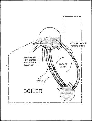 Figure 4-5.-Natural circulation (accelerated type). shown are almost vertical. The greater the incline, the greater the acceleration. So far, we have learned how the steam is formed in a boiler. Next, let's find out what happens to the steam once it returns to the steam drum from the generating tubes. |