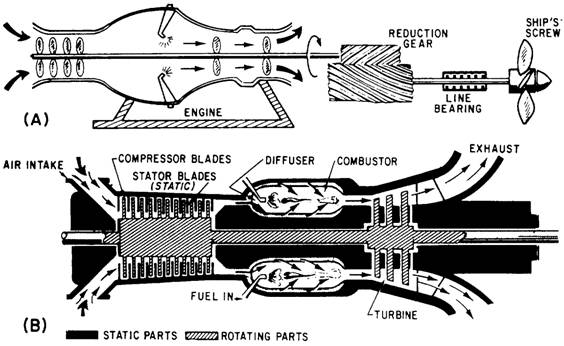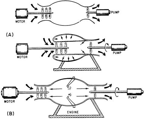 Figure 6-8.-Practical demonstration of turbine operating theory. By replacing the balloon with a stationary tube or container and filling the tube with air from a fan or series of fans, we can use the discharge air to do work by turning a fan at the rear of the tube (fig 6-7 view A). If fuel is added and combustion occurs, we greatly increase both the volume of air and the velocity that propels it over the fan. This increases the horsepower the fan will produce (fig 6-7 view B). The continuous pressure created by the inlet fan, or compressor, prevents the hot gases from going forward. Next, if we attach a shaft to the compressor and extend it back to a turbine wheel, we have a simple gas turbine. It can supply power to run its own compressor and still provide enough power to do useful work, such as to drive a generator or propel a ship (fig 6-8, view A). By comparing view A with view B in figure 6-8 you can see that a gas turbine is very similar to our balloon turbine. |
