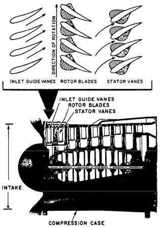 Figure 6-11.-Stator and rotor components of an axial-flow compressor. parallel to the axis of the compressor rotor. The compressor is located at the very front of the engine. The purpose of the axial compressor is to take in ambient air, increase the speed and pressure, and discharge the air through the diffuser into the combustion chamber. The two main elements of an axial-flow compressor are the rotor and stator (fig 6-11). The rotor is the rotating element of the compressor. The stator is the fixed element of the compressor. The rotor and stator are enclosed in the compressor case. The rotor has fixed blades that force the air rearward much like an aircraft propeller. In front of the first rotor stage are the inlet guide vanes (IGVs). These vanes direct the intake air toward the first set of rotor blades. Directly behind each rotor stage is a stator. The stat or directs the air rearward to the next rotor stage (fig 6-12). Each consecutive pair of rotor and stator blades constitutes a pressure stage.