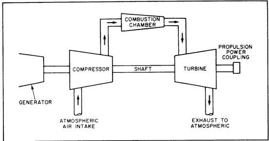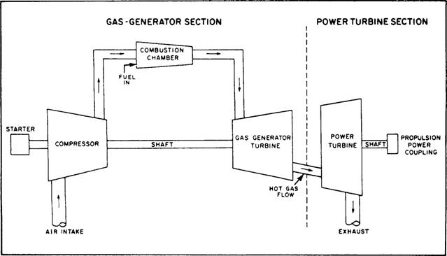 Figure 6-14.-Split-shaft gas turbine. The action of the rotor increases air compression at each stage and accelerates the air rearward. By virtue of this increased velocity, energy is transferred from the compressor to the air in the form of velocity energy. The number of stages required is determined by the amount of air and total pressure rise required. The greater the number of stages, the higher the compression ratio. Most present-day engines have 8 to 16 stages. |