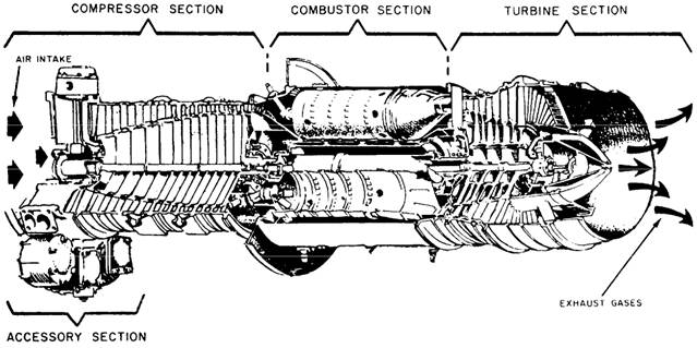 CLASSIFICATION BY POWER USAGE There are basically three types of gas turbines in use. They are the single shaft, split shaft, and twin spool. Of these, the single shaft and split shaft are the most common in naval vessels. We mention the twin-spool type because the U.S. Coast Guard Hamilton class cutters use the twinspool gas turbine. In current U.S. Navy service, the single-shaft engine is used primarily for driving ship's service generators. The split-shaft engine is used for main propulsion. Figure 6-13 is a block diagram of a single-shaft gas turbine. The power output shaft is connected directly to the same turbine rotor that drives the compressor. In most cases, there is a speed decreaser or reduction gear between the rotor and the power output shaft. However, there is still a mechanical connection throughout the entire engine. The arrangement shown is typical for the gas turbine generator sets aboard DD-963 and CG-47 class ships. In the split-shaft gas turbine fig 6-14 , there is no mechanical connection between the gasgenerator turbine and the power turbine. The power turbine is the component that does the usable work. The gas-generator turbine provides the power to drive the compressor and accessories. With this type of engine, the output speed can be varied by varying the gas generator speed. Also, under certain conditions, the gas generator can run at a reduced rpm and still provide maximum power turbine rpm. This greatly improves fuel economy and also extends the life of the gasgenerator turbine. The arrangement shown in (fig 6-15) is typical for propulsion gas turbines aboard the DD-963, FFG-7, CG-47, and PHM-1 class ships. ENGINE CONSTRUCTION Recall that a gas turbine engine is composed of four major sections ~: (1) compressor, (2) combustor, (3) turbine, and (4) accessory. We will briefly discuss the construction and function of each of these sections. We will use the LM2500 gas turbine as an example. The LM2500 is a splitshaft gas turbine.