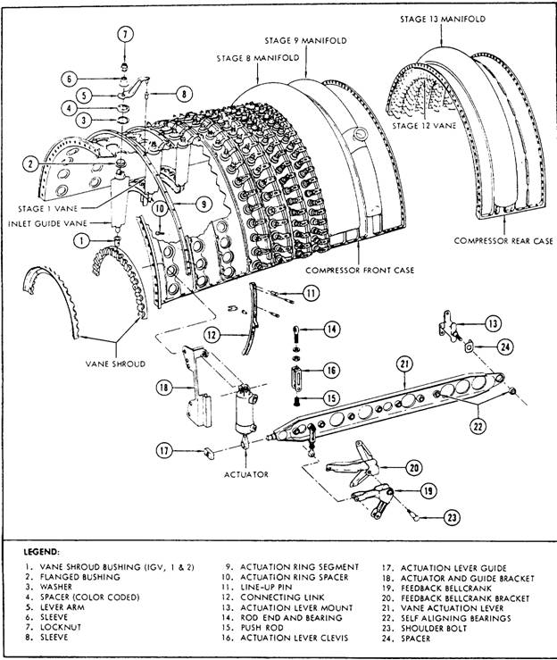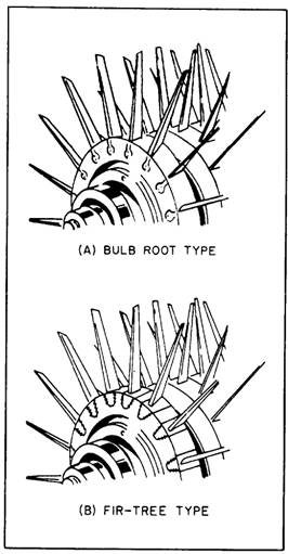 Figure 6-16.-Compressor case, LM2500 engine. Compressor The rotor and stators are enclosed in the compressor case (fig 6-16) . Modern engines use a case that is horizontally divided into upper and lower halves. The halves are normally bolted together with either dowel pins or fitted bolts. These parts ensure proper alignment to each other and in relation to other engine assemblies that bolt to either end of the compressor case. On some older engines, the case is a one-piece cylinder open on both ends. The one-piece compressor case is simpler to manufacture; however, any repair or detailed inspection of the compressor rotor is impossible. The engine must be removed and taken to a shop where it can be disassembled for repair or inspection of the rotor or stators. On many split-case engines, either the upper or lower case can be removed for maintenance and inspection with the engine in place. The compressor case is usually made of aluminum or steel. The material used will depend on the engine manufacturer and the accessories attached to the case. The compressor case may have external connections made as part of the case. These connections are normally used to bleed air during starting and acceleration or at low-speed operation. Preceding the stators and the first stage of the compressor rotor is a row of IGVs. The function of the IGVs varies somewhat, depending on the size of the engine and air-inlet construction. On smaller engines, the air inlet is not totally in line with the first stage of the rotor. The IGVs straighten the airflow and direct it to the first-stage rotor. On large engines, the IGVs can be moved to direct the airflow at the proper angle to reduce drag on the first-stage rotor. Small and medium engines have stationary stators. On large engines, the pitch of the vanes on several stators can be changed. For example, in the LM2500 engine fig. 6-16 the first six stators of the 16-stage rotor are variable, Rotor blades fig. 6-17 are usually made of stainless or iron-based, super-strength alloys. Methods of attaching the blades in the rotor disk rims vary in different designs, but they are commonly fitted into disks by either bulb (fig 6-17 view A) or fir-tree (fig 6-17 view B) type roots. The blades are then locked with grub screws, peening, lockwires, pins, or keys. The stator vanes project radially toward the rotor axis and fit closely on either side of each stage of the rotor. The stators have two functions. They receive air from the air inlet duct or from each preceding stage of the rotor and then deliver the air to the next stage or to combustors at a workable velocity and pressure. They also control the direction of air to each rotor stage to obtain the maximum compressor-blade efficiency. The stator vanes are usually made of steel with corrosion- and erosion-resistant qualities. Frequently, the vanes are shrouded by a band of suitable material to simplify the fastening problem. The vanes are welded into the shrouds, and the outer shrouds are secured to the inner wall of the compressor case by retaining screws. Combustion Chambers There are three types of combustion chambers: (1) can type, (2) annular type, and (3) can-annular type. The can-type chamber is used primarily on