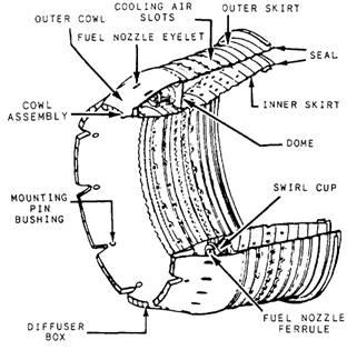 engines that have a centrifugal compressor. The annular and can-annular types are used on axialflow compressors. The combustion chambers have presented one of the biggest problems in gas turbines. The extreme stresses and temperatures encountered are not experienced in other types of internalcombustion engines. The liners are subjected to temperatures as high as 4000F in a matter of seconds. The combustion chamber must operate over a wide range of conditions. It must withstand high rates of burning, have a minimum pressure drop, be light in weight, and have minimum bulk. The inner and outer liners or shrouds are perforated with many holes and slots throughout their length. Air is admitted through these holes to protect the liner and to cool the gases at the chamber outlet. The through-flow passages are used in practically all modern engine combustion chambers. In the through-flow path, the gases pass through the combustion section without a change in direction. The annular combustor liner (fig 6-18) is usually found on axial-flow engines. It is probably one of the most popular combustion systems in use. The construction consists of a housing and liner. On large engines, the liner consists of an undivided circular shroud extending all the way around the outside of the turbine shaft housing. A large one-piece combustor case covers the liner and is attached at the turbine section and diffuser section. The dome of the liner has small slots and holes to admit primary air and to impart a swirling motion for better atomization of fuel. There are also holes in the dome for the fuel nozzles to extend through into the combustion area. The inner and outer liners form the combustion space. The outer liner keeps flame from contacting the combustor case, and the inner liner prevents flame from contacting the turbine shaft housing. Large holes and slots are located along the liners to (1) admit some cooling air into the