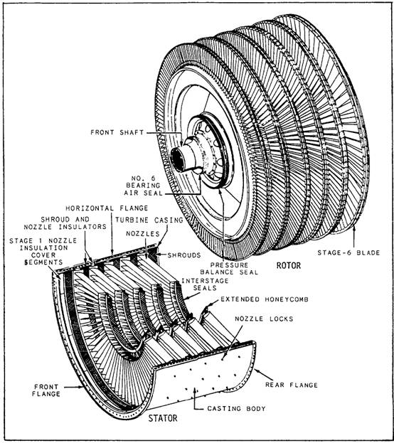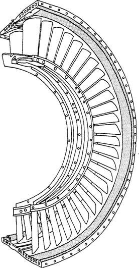 Figure 6-19.-Stator element of turbine assembly. element is shown in figure 6-19. A rotor element is shown in figure 6-20. The rotor element of the turbine consists of a shaft and bladed wheel(s). The wheel(s) are attached to the main power transmitting shaft of the gas turbine engine. The jets of combustion gas leaving the vanes of the stator element act upon the turbine blades and cause the turbine wheel to rotate in a speed range of 3,600 to 42,000 rpm, depending upon the type of engine. The high rotational speed imposes severe centrifugal loads on the turbine wheel. At the same time, the high temperature (1050 to 2300 F) results in a lowering of the strength of the material. Consequently, the engine speed and temperature must be controlled to keep turbine operation within safe limits. The operating life of the turbine blading usually determines the life of the gas turbine engine. The turbine wheel is a dynamically balanced unit consisting of blades attached to a rotating disk. The disk, in turn, is attached to the rotor shaft of the engine. The high-velocity exhaust gases leaving the turbine nozzle vanes act on the blades of the turbine wheel. This causes the assembly to rotate at a high rate of speed. This turbine rotation, in turn, causes the compressor to rotate.