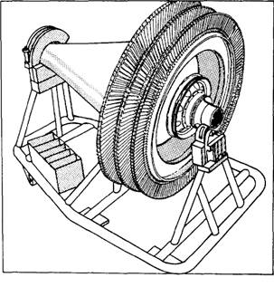 Figure 6-18.-Combustor liner. combustion space towards the rear of the space to help cool the hot gases to a safe level, (2) center the flame, and (3) admit air for combustion. The gases are cooled enough to prevent warpage of the liners. The space between the liners and the case and shaft housing forms the path for secondary air. The secondary air provides film cooling of the liners and the combustor case and shaft housing. At the end of the combustion space and just before the first-stage turbine nozzle, the secondary air is mixed with the combustion gases to cool them enough to prevent warping and melting of the turbine section. The annular-type combustion chamber is a very efficient system that minimizes bulk and can be used most effectively in limited space. There are some disadvantages, however. On some engines, the liners are one-piece and cannot be removed without engine disassembly. Turbines In theory, design, and operating characteristics, the turbines used in gas turbine engines are quite similar to the turbines used in a steam plant. The gas turbine differs from the steam turbine chiefly in (1) the type of blading material used, (2) the means provided for cooling the turbine shaft bearings, and (3) the lower ratio of blade length to wheel diameter. The terms gas generator turbine and power turbine are used to differentiate between the turbines. The gas-generator turbine powers the gas generator and accessories. The power turbine powers the ship's propeller through the reduction gear and shafting. The turbine that drives the gas generator is located directly behind the combustion chamber outlet. This turbine consists of two basic elements: the stator or nozzle and the rotor. Part of a stator